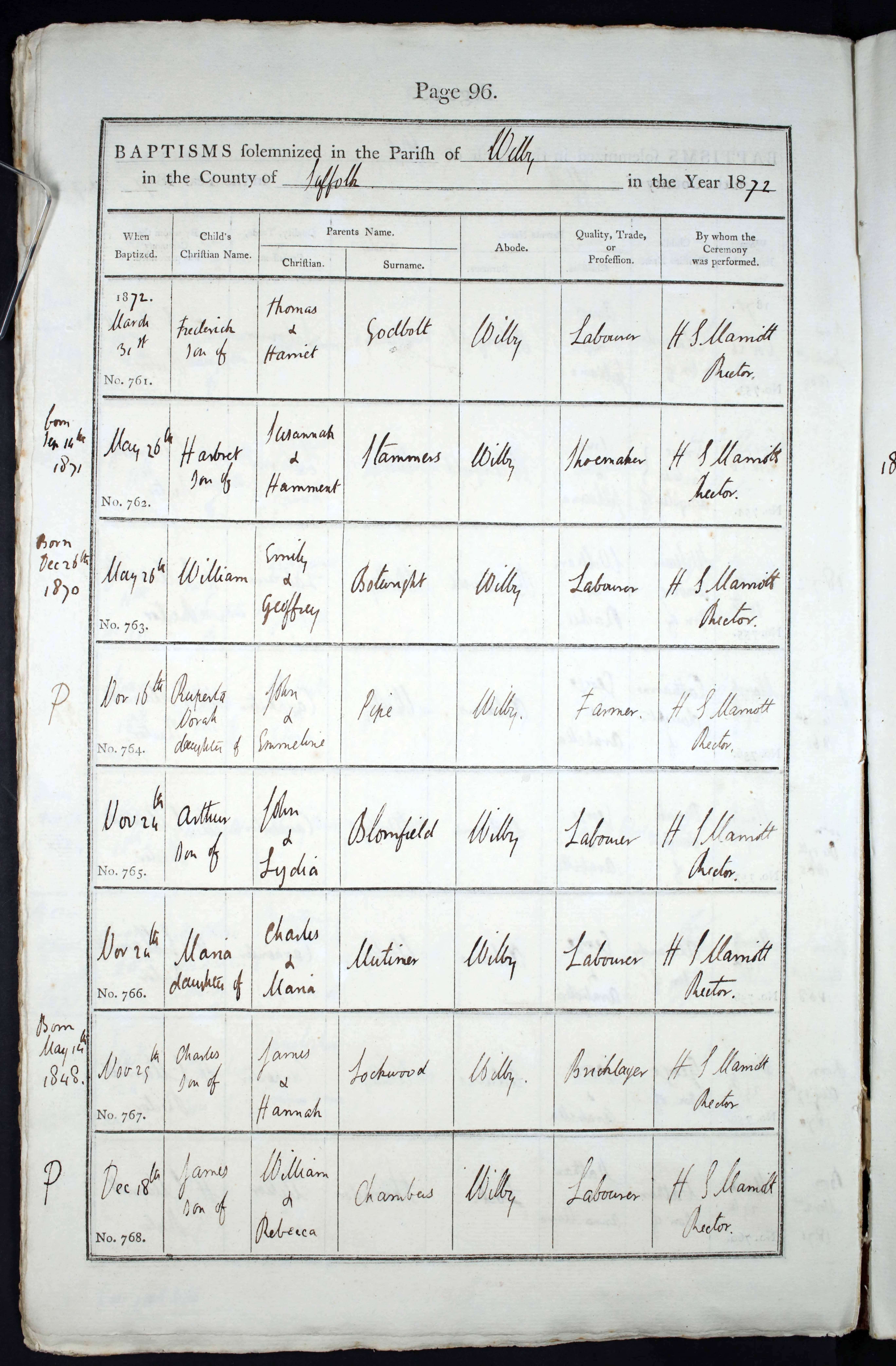 - James Chambers was baptised privately on 18 Dec, 1872 at St. Mary's Church, Wilby, Suffolk, England