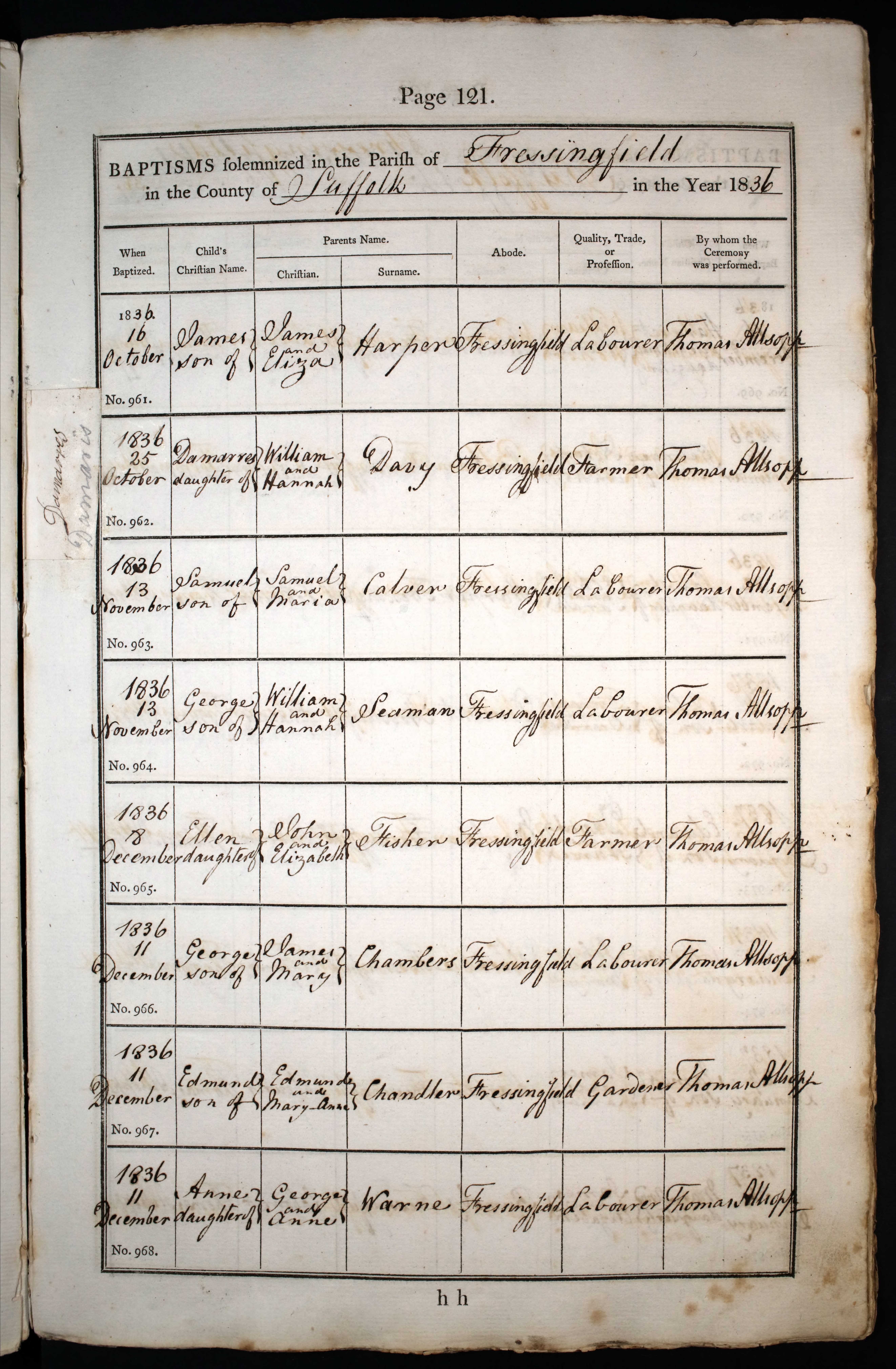 Parish Registers of St Peter & St Paul, Fressingfield, Suffolk; Baptism entry for George Chambers, 11 Dec 1836, Page 121, No 966.
