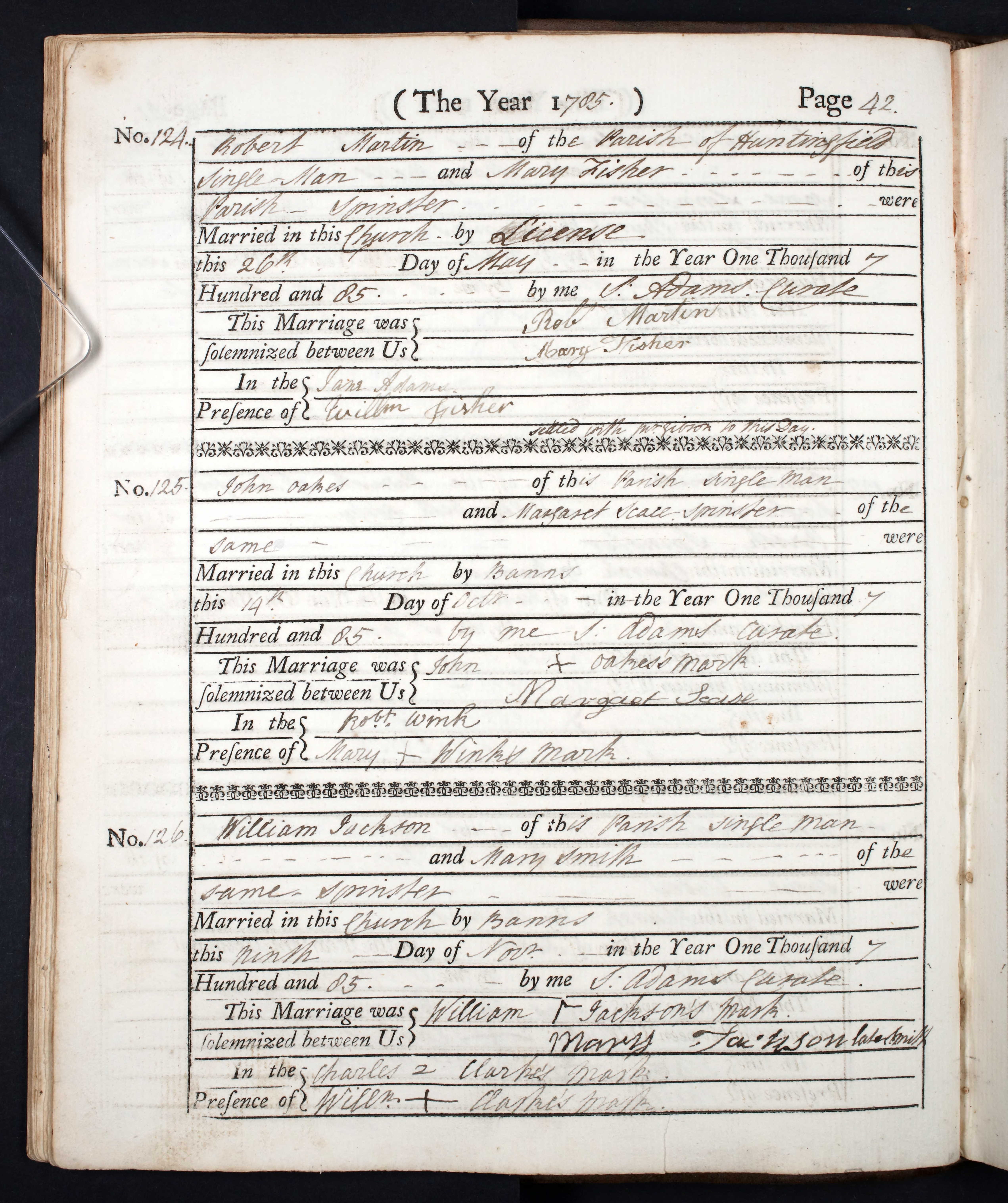 Marriage entry for Robert Martin and Mary Fisher, 26 May 1785, Page 42, No 124