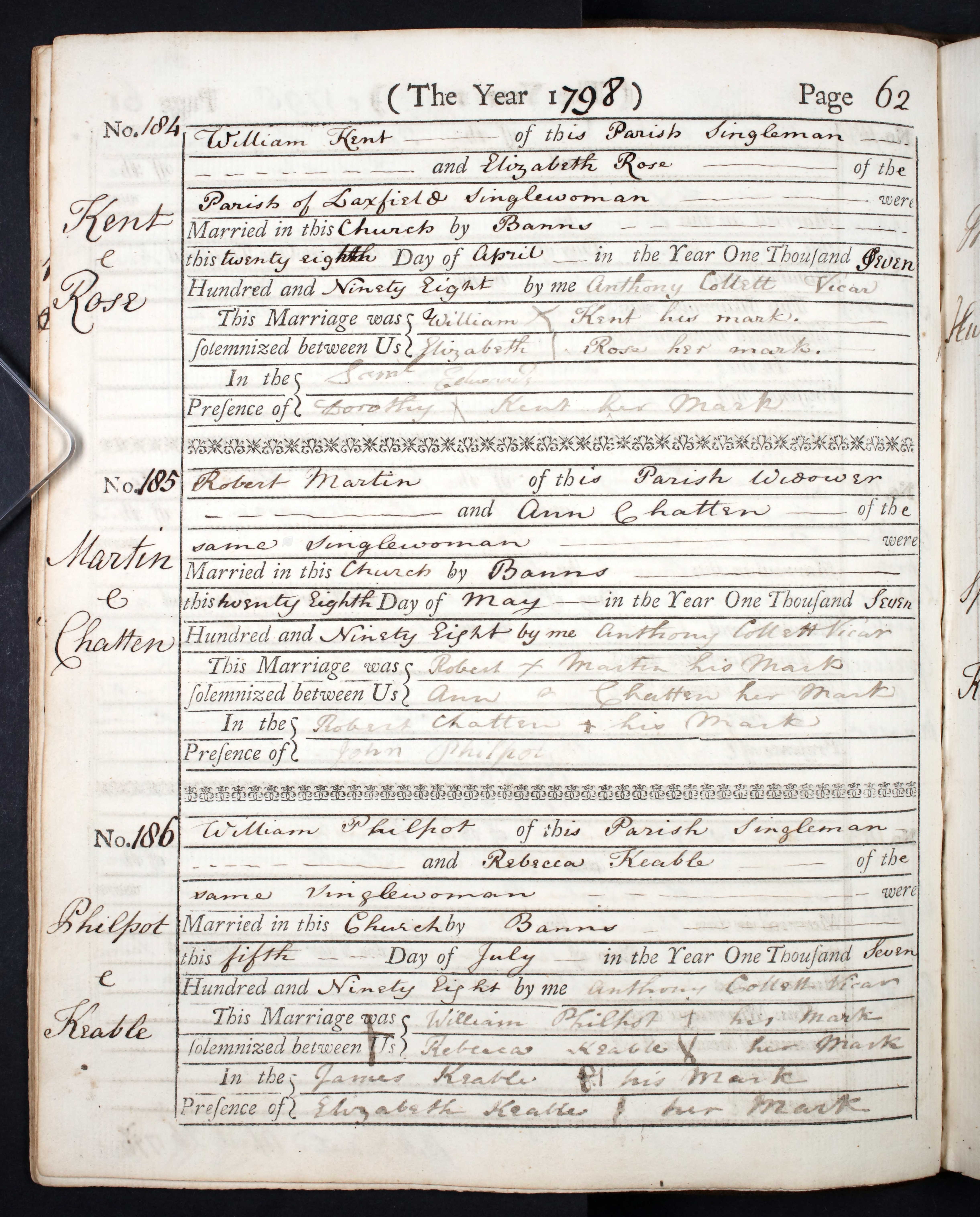 Parish Registers of St. Mary, Cratfield, Suffolk; Marriage entry for Robert Martin and Ann Chatten, 28 May 1798, Page 62, No 185.