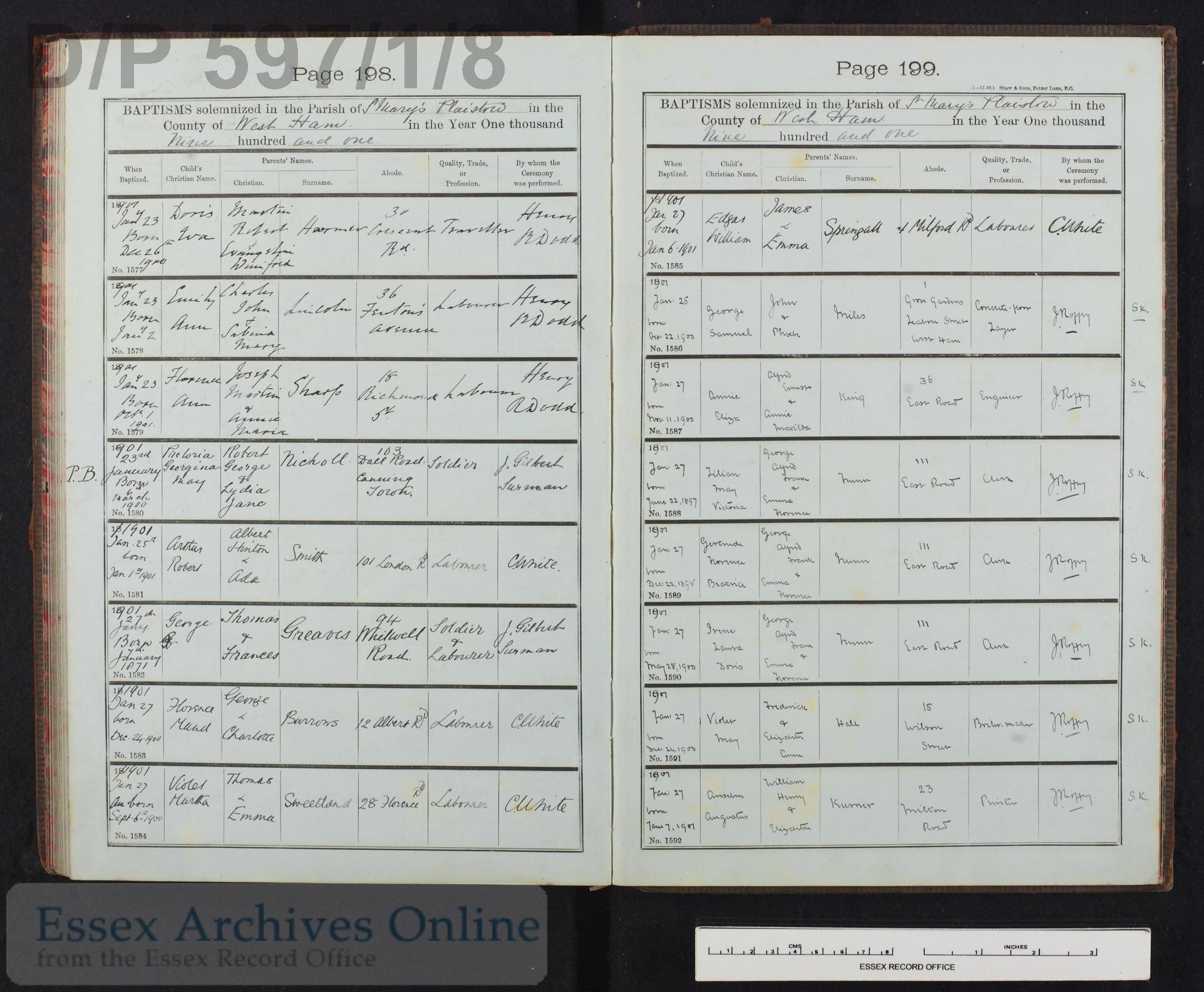 Parish Registers of St. Mary, Plaistow, Essex; Baptism entry for Violet Martha Sweetland, 27 Jan 1901, Page 198, No 1584.