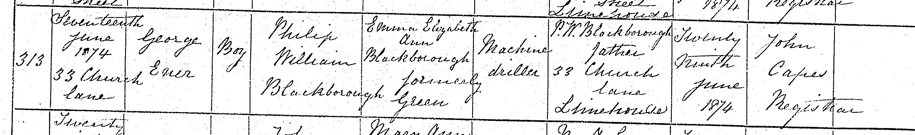 Birth in the Registration District of Stepney, Middlesex, 1874, no. 313. Born 17 Jun 1874 at 33 Church Lane; George Ener; Boy; father Philip William Blackborough; mother Emma Elizabeth Ann Blackborough fornerly Green. Occupation of father: Machine Driller. Informant was P.W. Blackborough; Father; 33 Church Lane, Limehouse; signed name. The birth was registered 27 Jun 1874.
