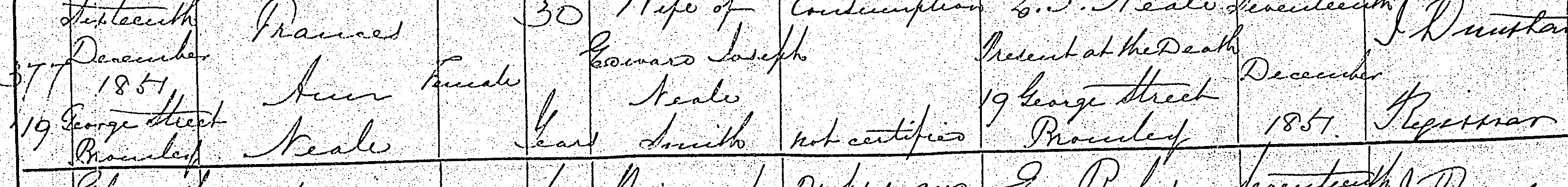 Death in the Registration District of Poplar, Middlesex, 1851, no. 377. Died 13 Dec 1851 at 19 George Street, Bromley; Frances Ann Neale; Female; age 30; Wife of Edward Joseph Neale, Smith. Cause of death: Consumption, not certified. Informant was E. J. Neale (signed name); relation: Not known; residing at 19 George Street, Bromley; present at death. The death was registered 17 Dec 1857.