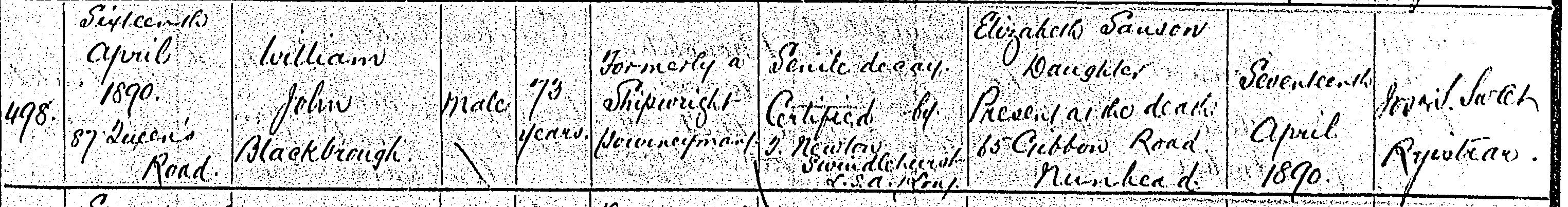 Death in the Registration District of Camberwell, , 1890, no. 498. Died 16 Apr 1890 at 87 Queen's Road; William John Blackbrough; Male; age 73; Formerly a Shipwright (journeyman). Cause of death: Senile Decay, certified. Informant was Elizabeth Sansen (signed name); relation: Daughter; residing at 65 Gibbon Road, Nunhead; present at death. The death was registered 17 Apr 1890.