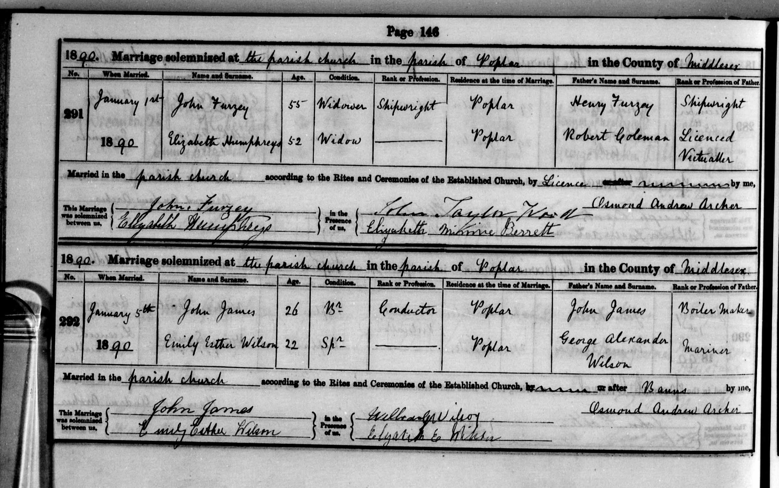 Parish Registers of All Saints, Poplar, Middlesex; Marriage entry for John Furzey and Elizabeth Humphreys, 1 Jan 1890, Page 146, No 291.