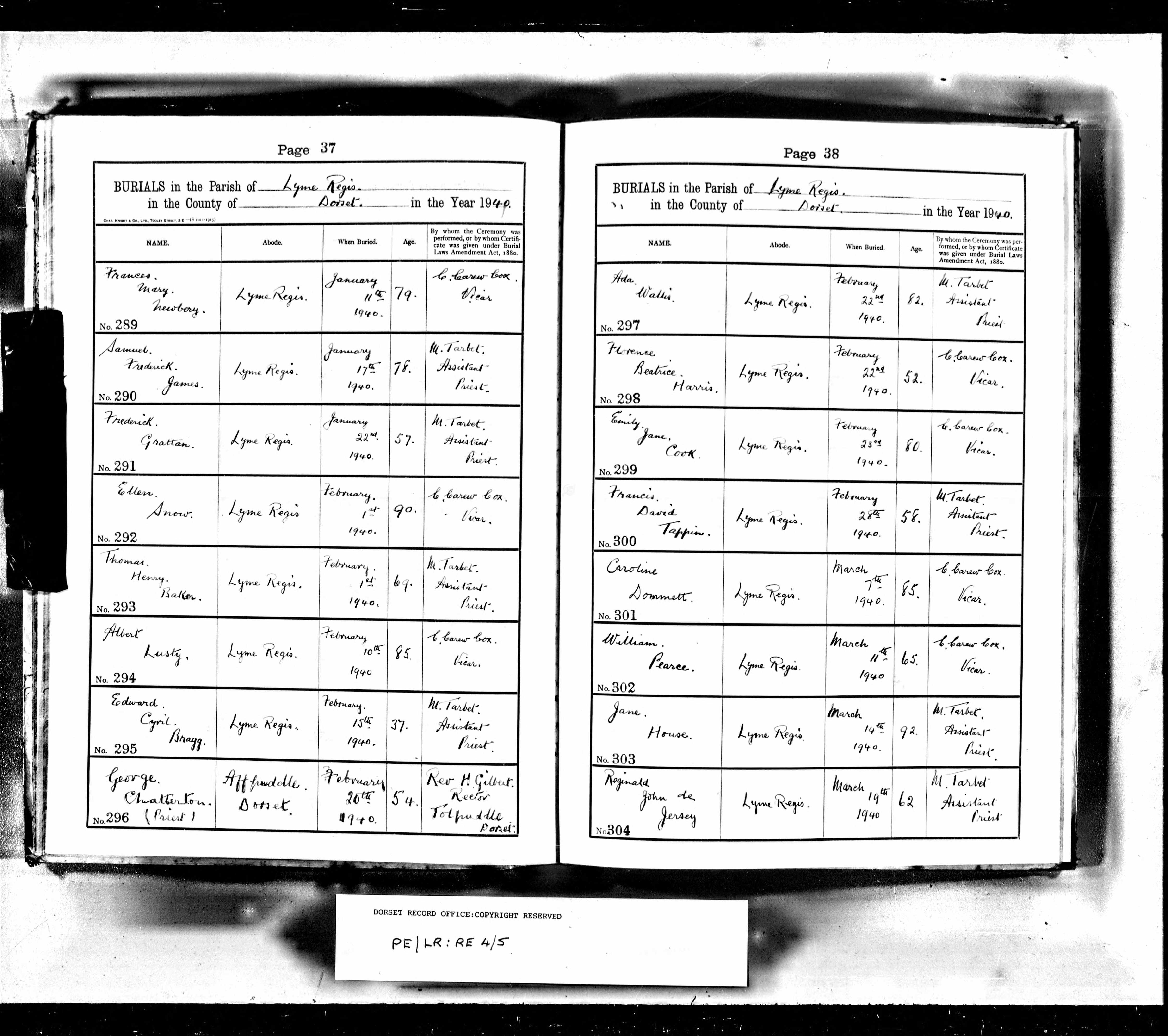 Parish Registers of St. Michael the Archangel, Lyme Regis, Dorset; Burial entry for Frances Mary Newbery, 11 Jan 1940, Page 37, No 289.