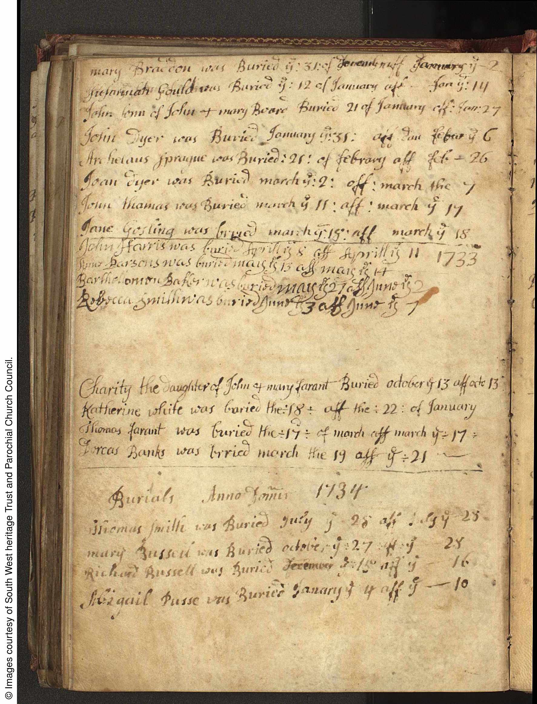Parish Registers of St Michael, Shute, Devon; Burial entry for Charity Farant, 13 Oct 1733.
