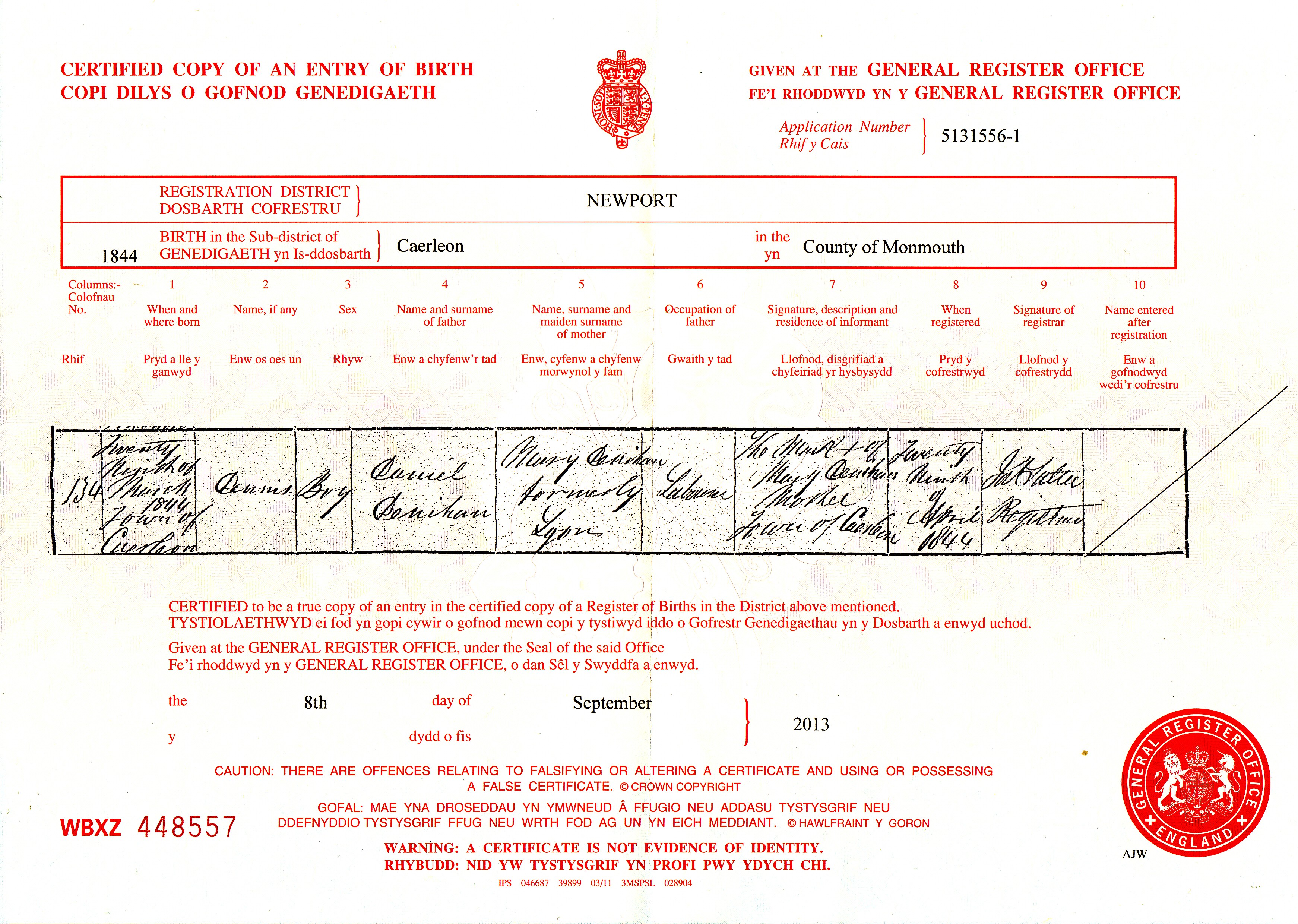 Birth in the Registration District of Newport, Sub-district of Caerleon, Monmouth, 1844, no. 134. Born 29 Mar 1844 at Town of Caerleon; Dennis Denihan; Boy; father Daniel Denihan; mother Mary Denihan formerly Lyon. Occupation of father: Labourer. Informant was Mary Denihan; Mother; Town of Caerleon; could not sign name. The birth was registered 29 Apr 1844.