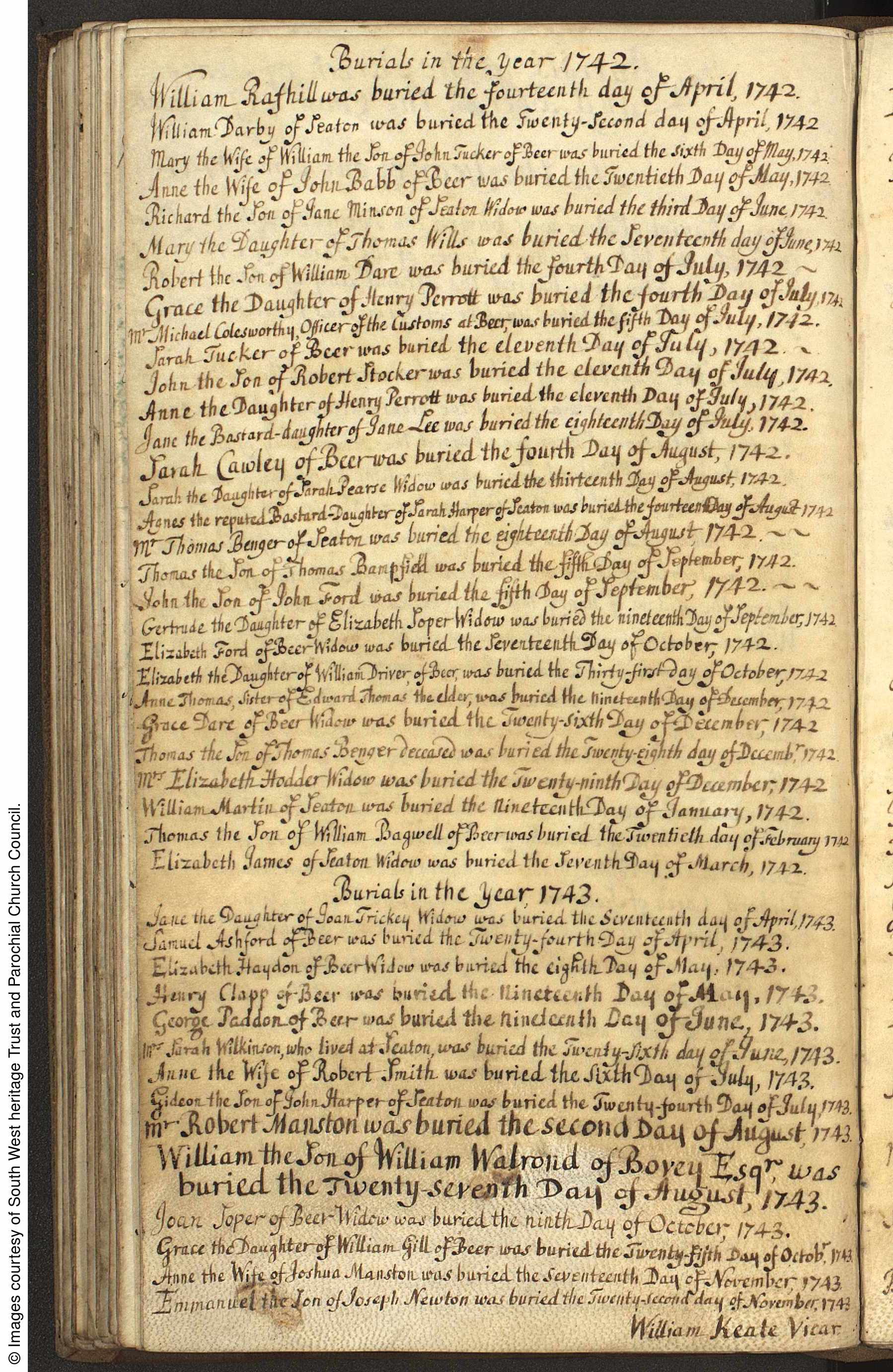 Parish Registers of St. Gregory, Seaton & Beer, Devon; Burial entry for Jane Trickey, 17 Apr 1743.