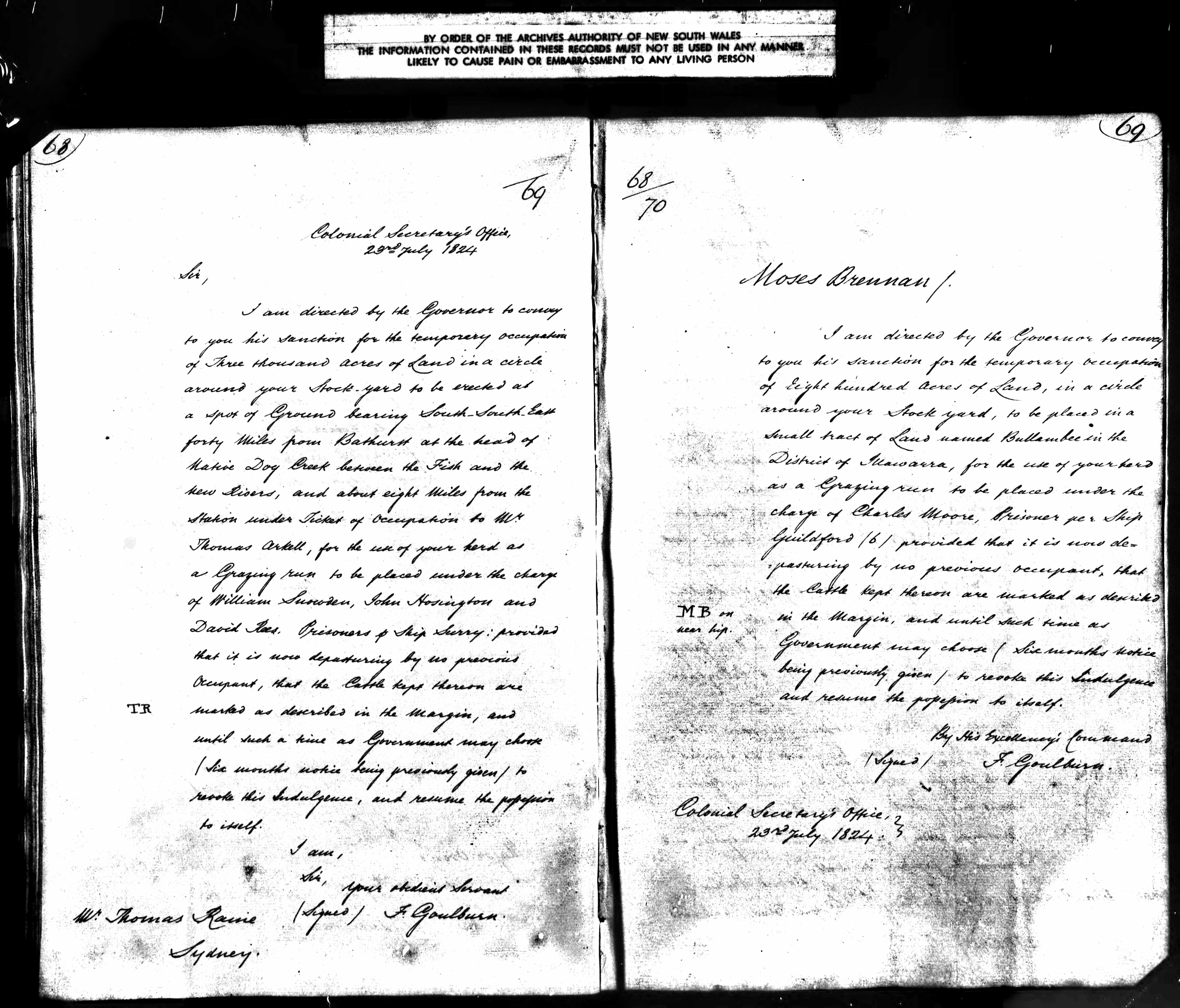 Letter to Thomas Raine regarding occupation of land forty miles from Bathurst at the head of Native Dog Creek, 23 Jul 1824, Page 68 (Fiche 3106, 4/1839A No.798 p.235; Reel 6013, 4/3512 p.68)