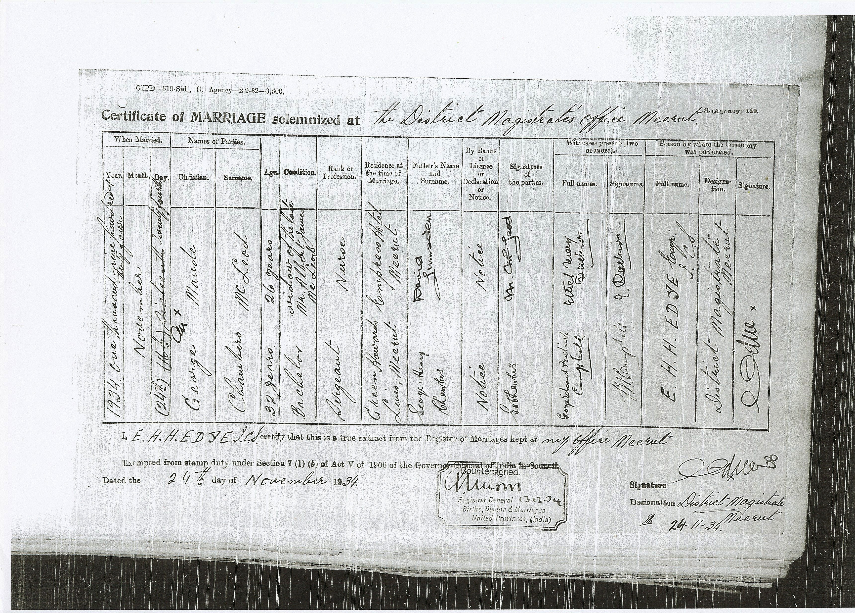 Marriage certificate for George Chambers and Maude McLeod, Meerut, 24 Nov 1934
