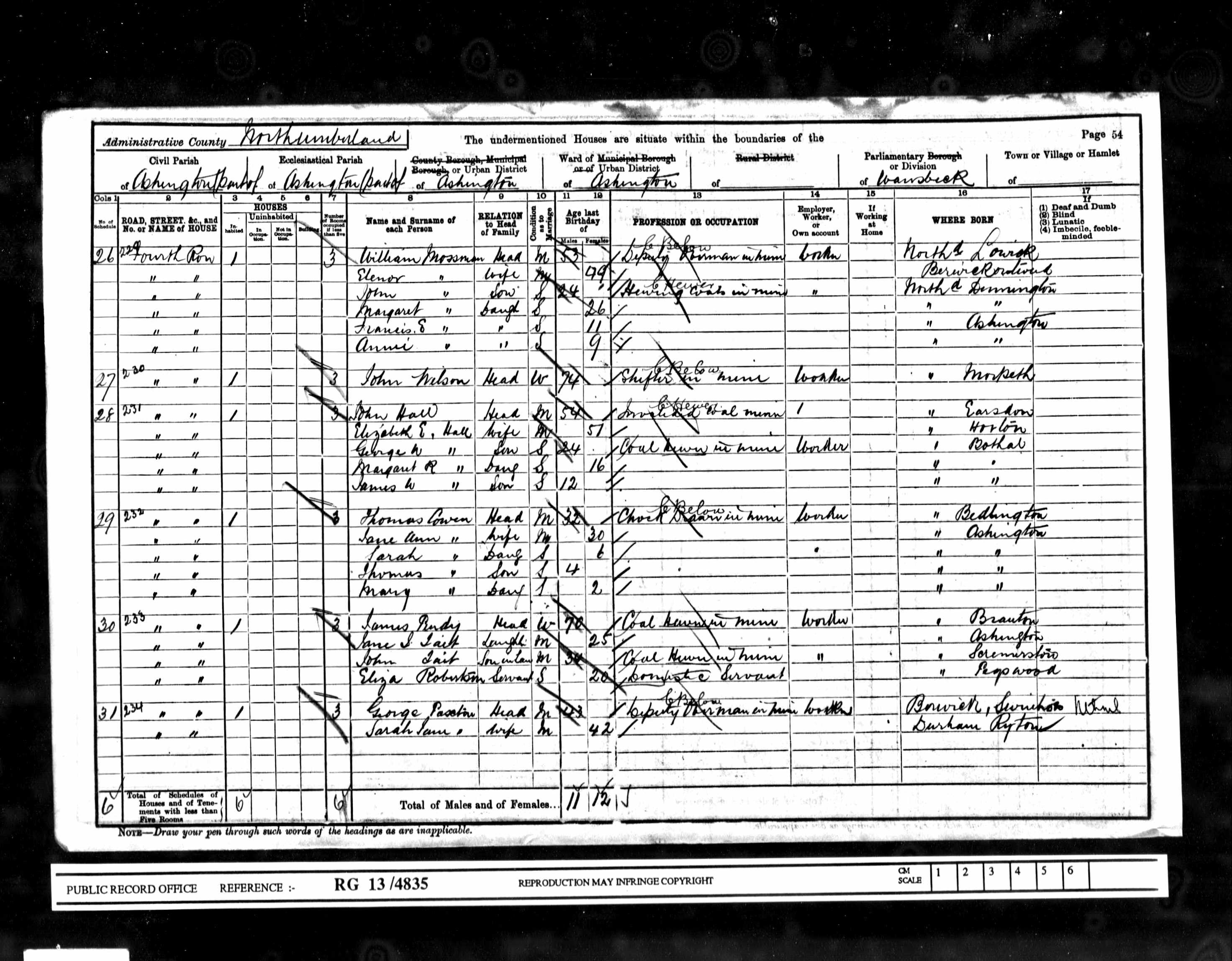 - was recorded in the census on 31 Mar, 1901 at 231 Fourth Row, Ashington, Bothal Demesne, Northumberland, England