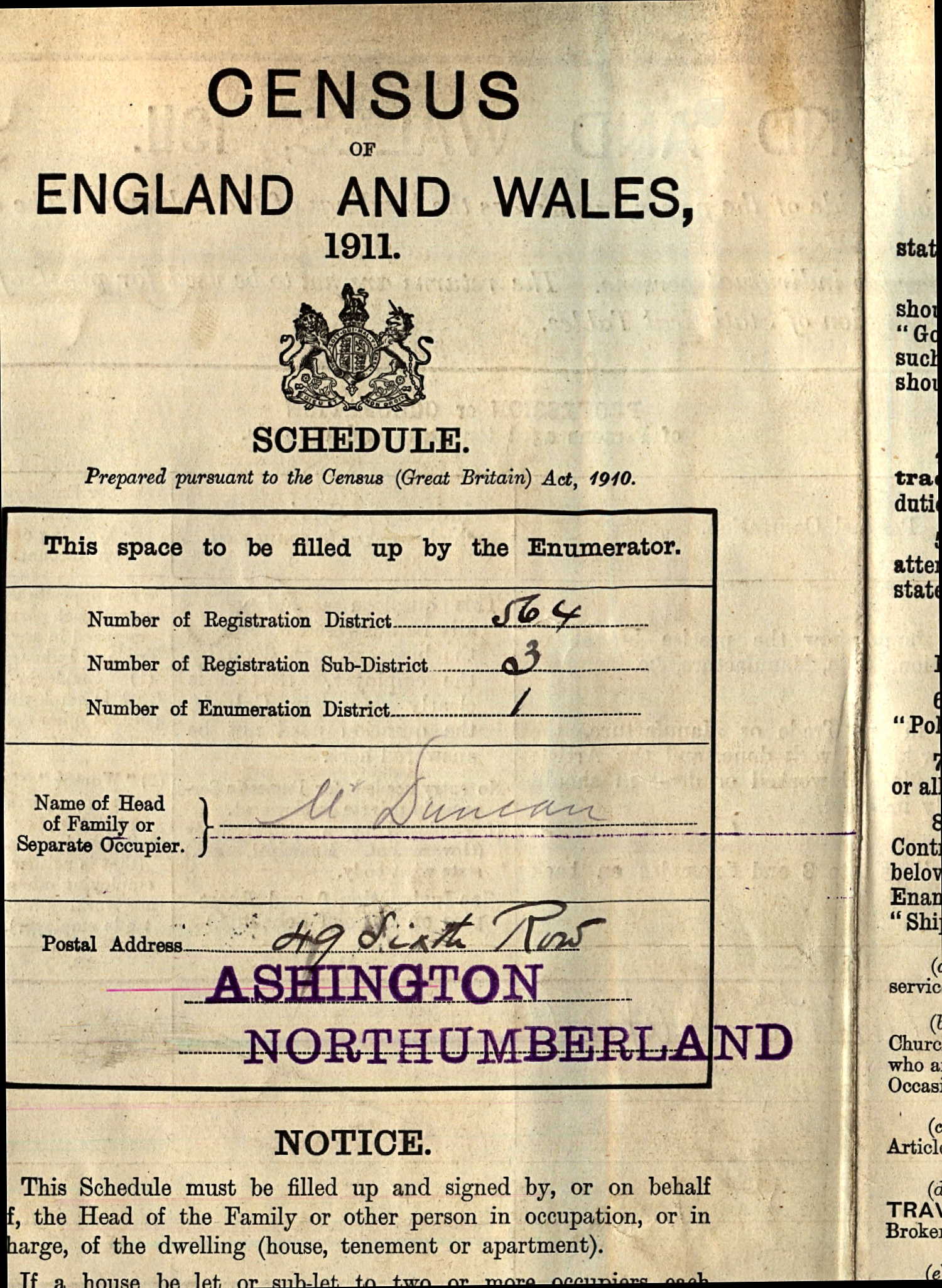 - was recorded in the census on 2 Apr, 1911 at 49 Sixth Row, Ashington, Bothal Demesne, Northumberland, England