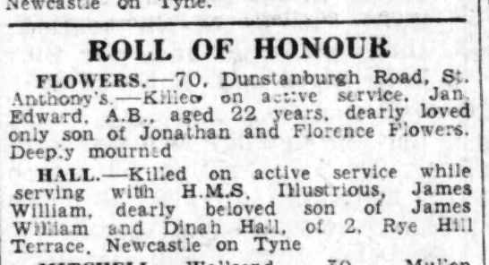 HALL — Killed on active service while serving with H.M.S. Illustrious, James William, dearly beloved son of James William and Dinah Hall, of 2, Rye Hill Terrace, Newcastle on Tyne.