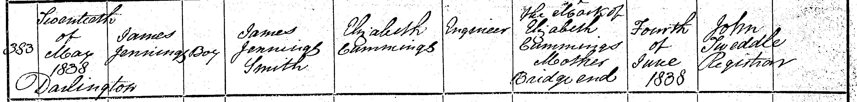 Birth in the Registration District of Darlington, Durham, 1838, no. 383. Born 17 May 1838 at Darlington; James Jennings Smith; Boy; father James Jennings Smith; mother Elizabeth Cummings. Occupation of father: Engineer. Informant was Elizabeth Cummings; Mother; Bridge end; could not sign name. The birth was registered 4 Jun 1838.