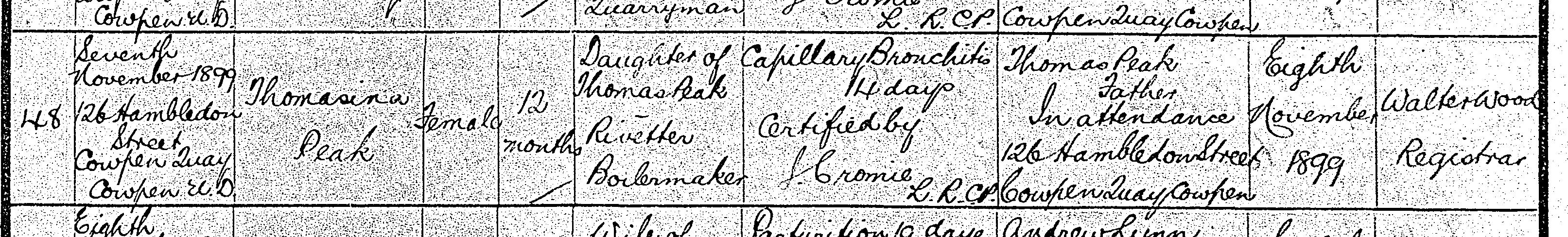 Death in the Registration District of Tynemouth, Northumberland, 1899, no. 48. Died 7 Nov 1899 at 126 Hambledon Street, Cowpen Quay, Cowpen; Thomasina Peak; Female; age 12 months; Daughter of Thomas Peak, Rivetter Boilermaker. Cause of death: Capillary Bronchitis 14 days, certified. Informant was Thomas Peak (signed name); relation: Father; residing at 126 Hambledon Street, Cowpen Quay, Cowpen; present at death. The death was registered 8 Nov 1899.