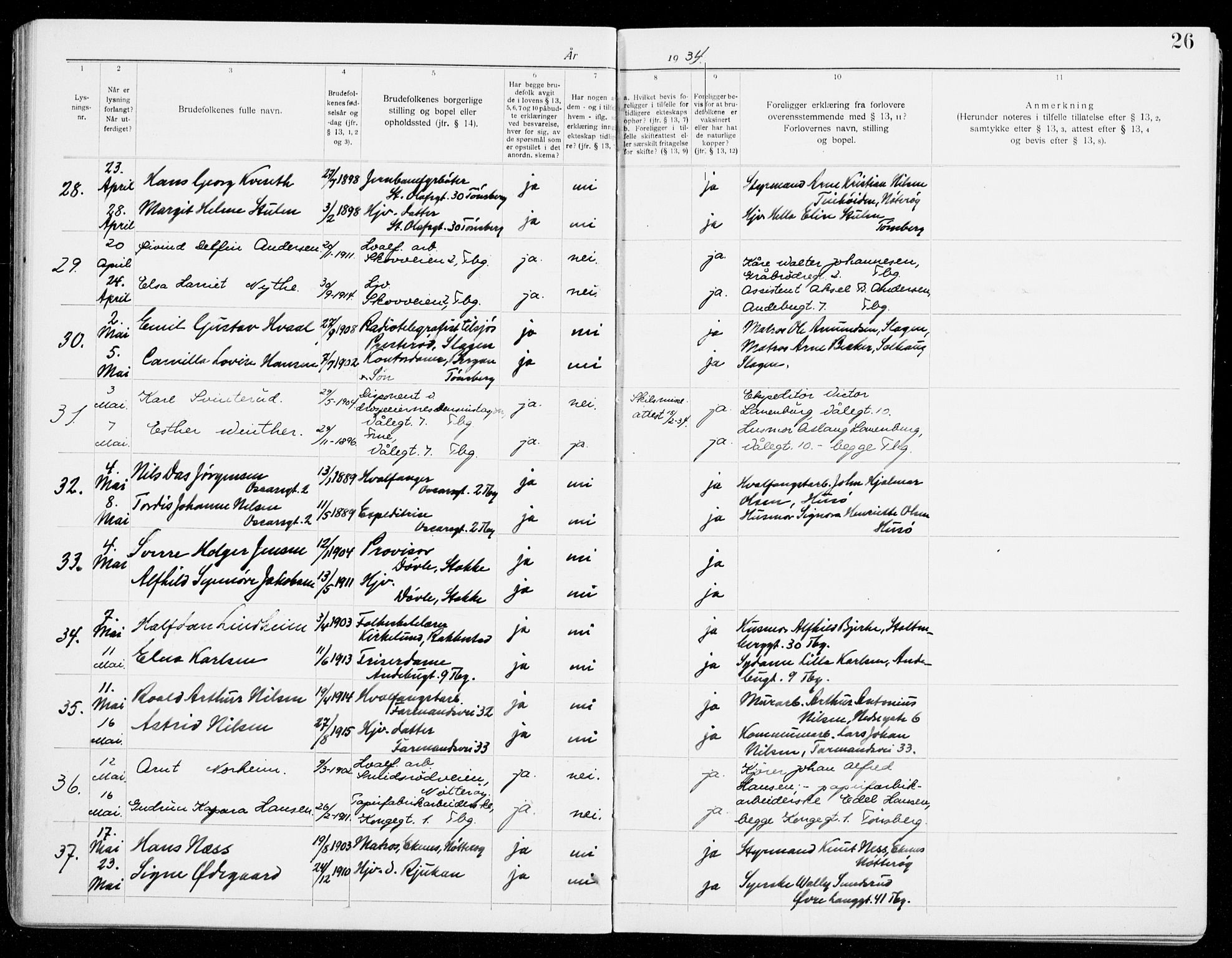 Church books of Tønsberg, Vestfold, Norway; Marriage banns entry for Emil Gustav Hvaal and Camila Lovise Hansen, 2 Mar 1934, AV/SAKO-A-330/H/Ha/L0008 (Lysningsprotokoll nr. 8, 1931-1940), Page 26, No 30.