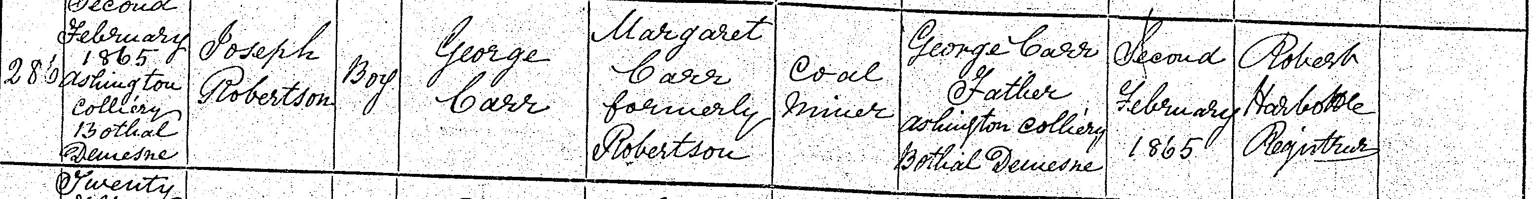 Birth in the Registration District of Morpeth, Northumberland, 1865, no. 286. Born 2 Feb 1865 at Ashington Colliery, Bothal Demesne; Joseph Robertson Carr; Boy; father George Carr; mother Margaret Carr formerly Robertson. Occupation of father: Coal Miner. Informant was George Carr; Father; Ashington Colliery, Bothal Demesne; signed name. The birth was registered 2 Feb 1865.