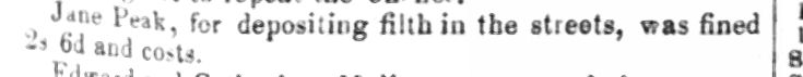 Jane Peak, for depositing filth in the streets, was fined 2s 6d and costs.