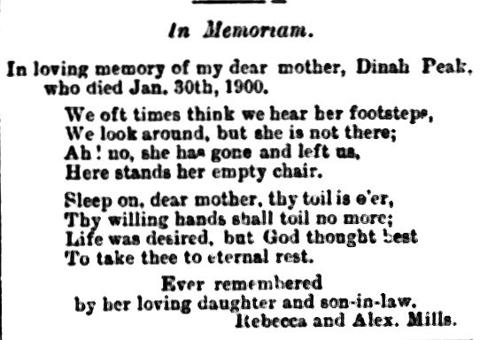 Shields Daily News, No 12250, 30 Jan 1901, Page 3, Col 7, Births Marriages and Deaths, In Memoriam, Dinah Peak