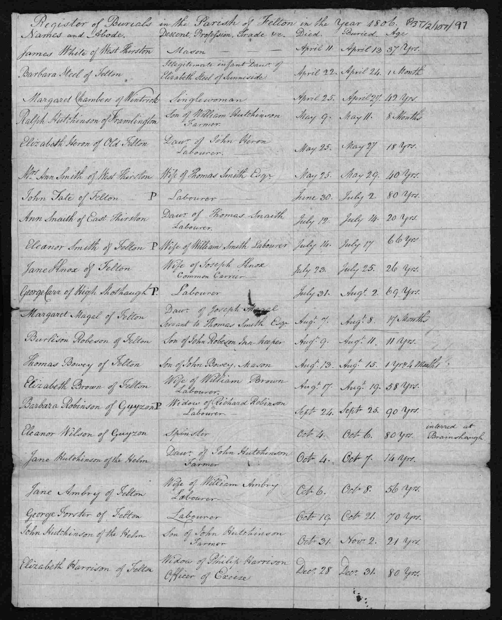 Jane Ambry of Felton, wife of William Ambry, Labourer, died Oct 6, buried Oct 8, age 56
