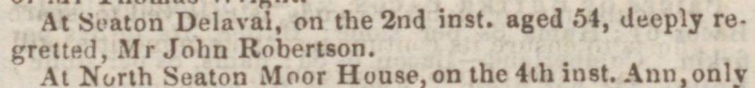 As Seaton Delaval, on the 2nd inst. aged 54, deeply regretted, Mr John Robertson