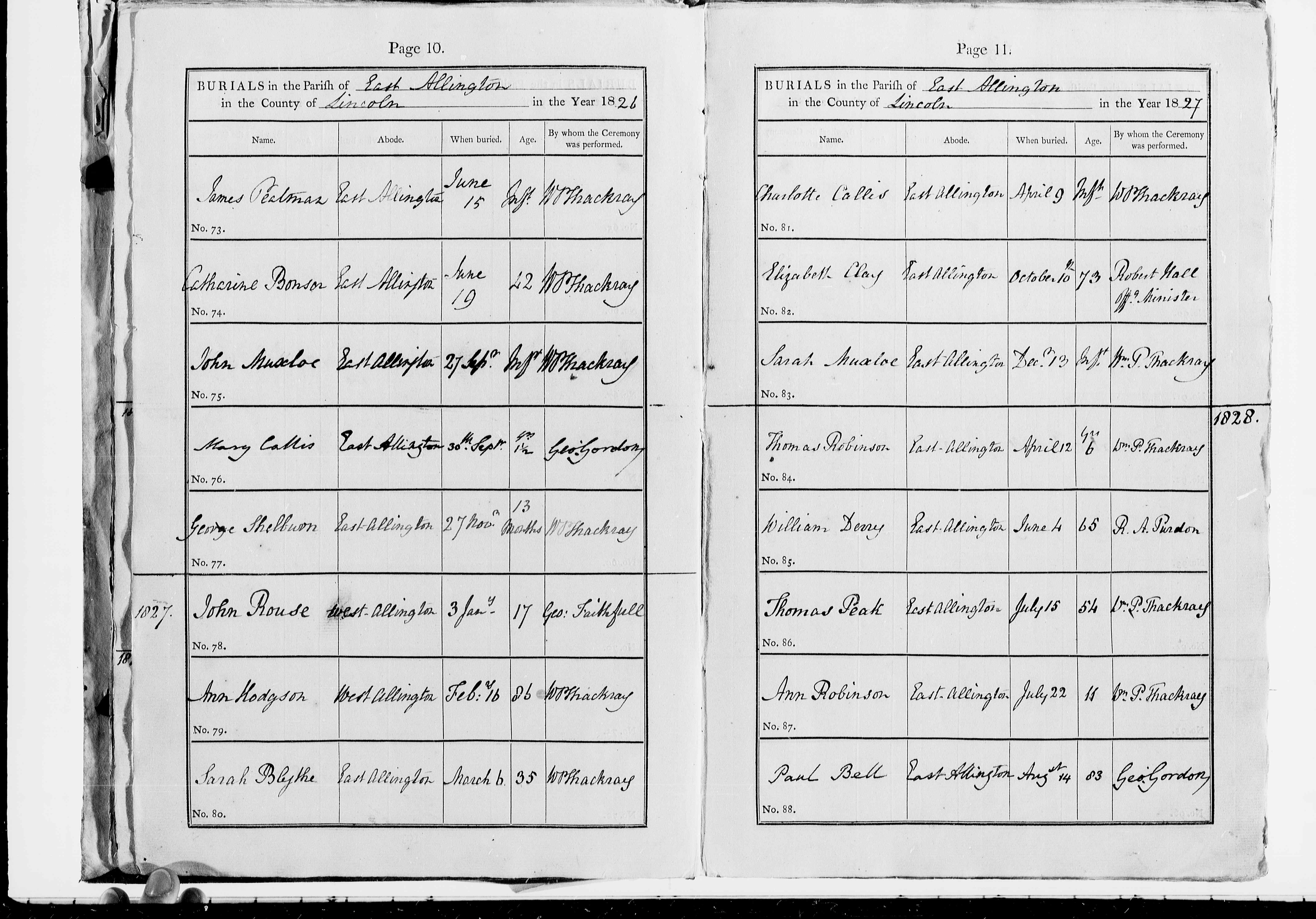 Parish Registers of St. James, East Allington, Lincolnshire; Burial entry for Thomas Peak, 15 Jul 1828, Page 11, No 86.