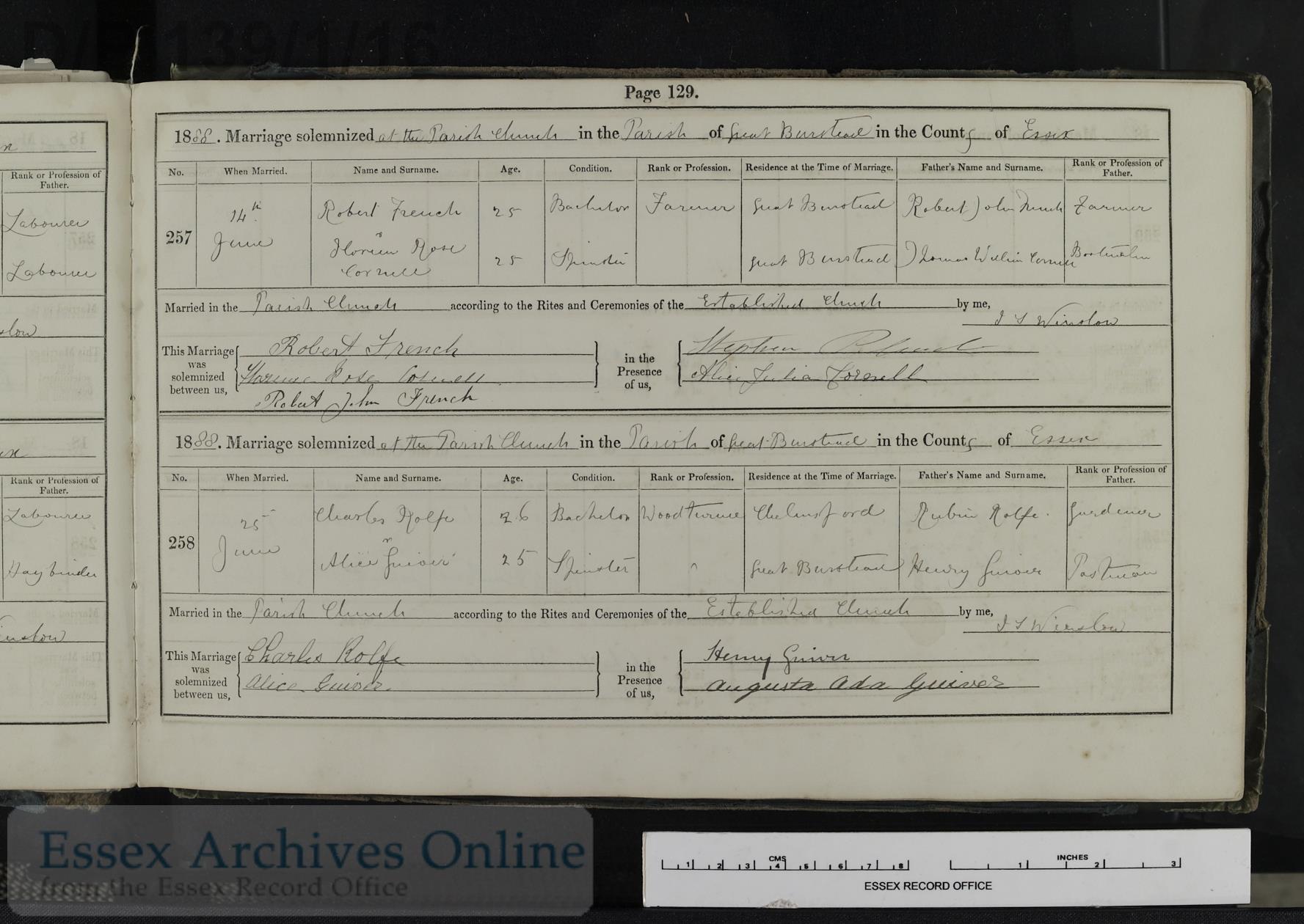 Parish Registers of St. Mary Magdalene, Great Burstead, Essex; Marriage entry for Charles Rolfe and Alice Guiver, 25 Jun 1888, Page 129, No 258.